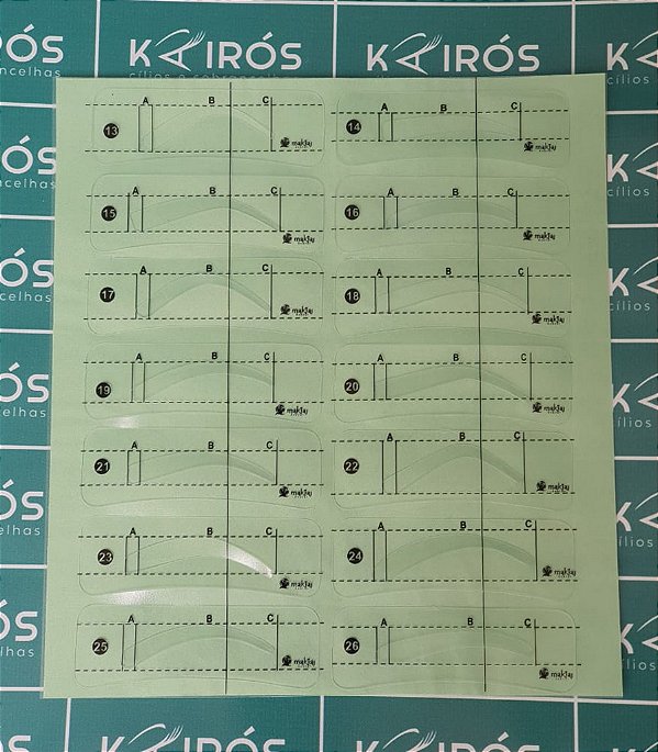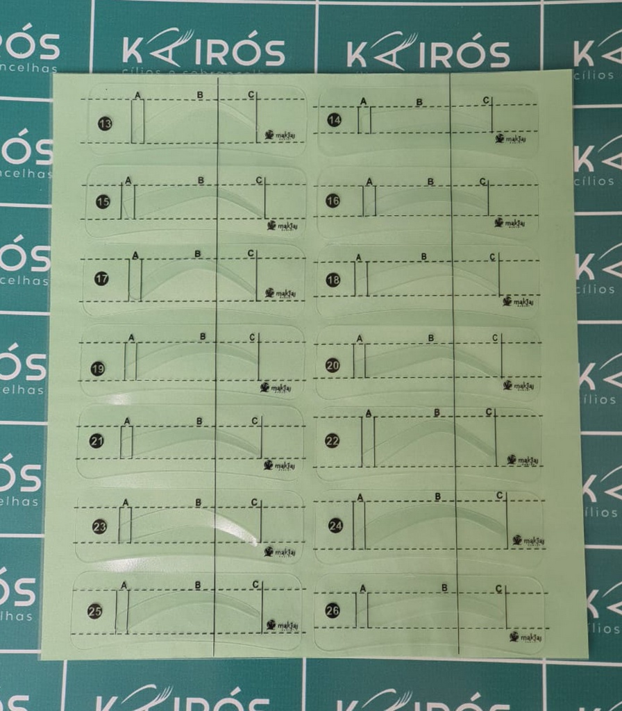 Cartela com 26 moldes de sobrancelhas.