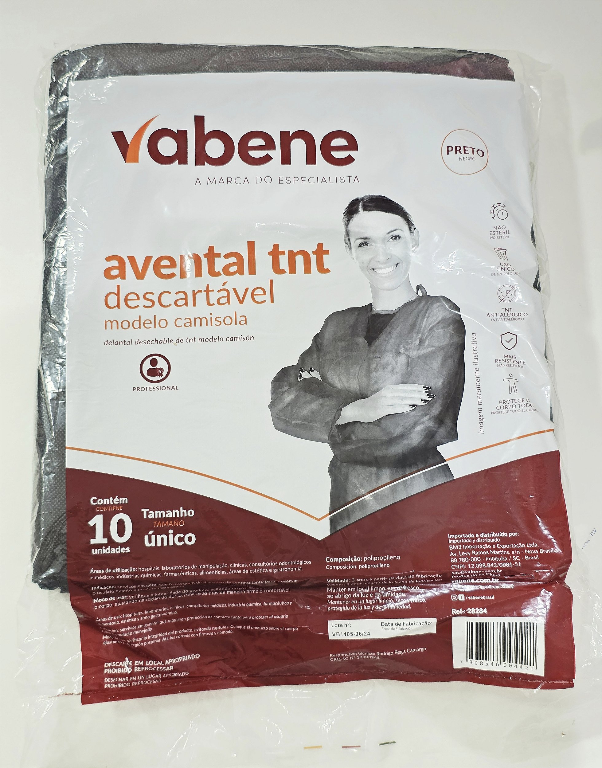 Avental TNT Manga Longa Preto 10uni Vabene